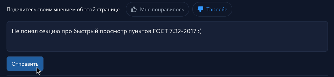 Документация Typst Gost — это интерактивная среда: примеры можно менять прямо на странице, а также доступен просмотр цитат из ГОСТ 7.32-2017. Вы можете воспользоваться формой обратной связи в конце страницы документации, чтобы помочь нам улучшить её.